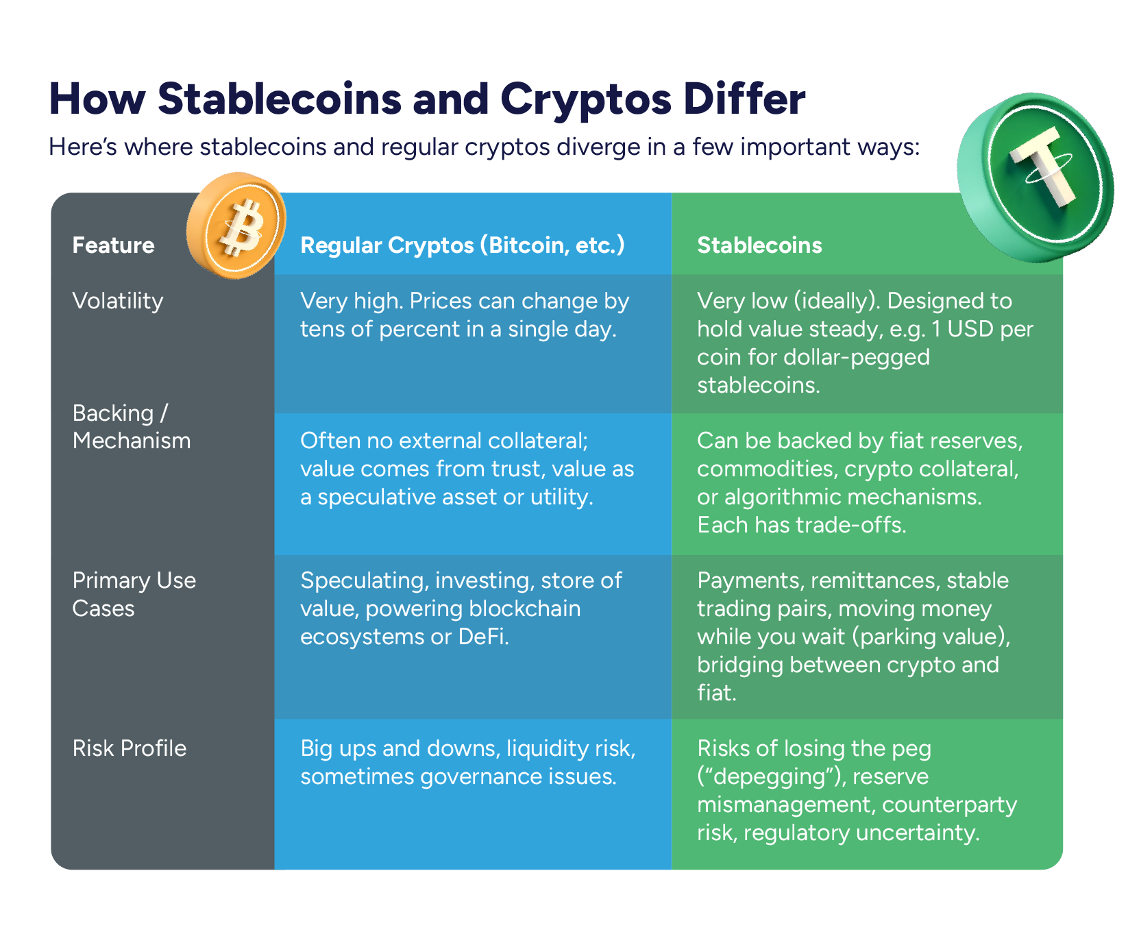 Stablecoins aim to change that. Think of them as cryptocurrencies designed to stay steady. Usually, they match (or peg) the value of something stable, often a fiat currency. I.e., money that a government declares to be legal tender, but it is not backed by a physical commodity like gold or silver. Its value comes not from any intrinsic material worth, but from trust in the government that issues it. Sometimes the peg is to a commodity or a basket of assets. That stability makes them useful in ways most volatile cryptos are not.